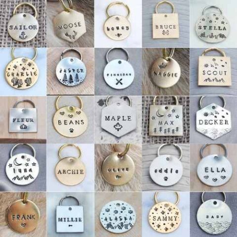 These hand stamped dog tags are the perfect addition to your pet’s wardrobe. These ID tags feature your pet’s name, as well as a unique design on the front. You can also choose to add your phone number to the back of the tag - just in case your pup ever decides to take off on an adventure. **In the CART notes at checkout, please include your pet's name, the font you would like, Design and phone number (if you would like it included)**